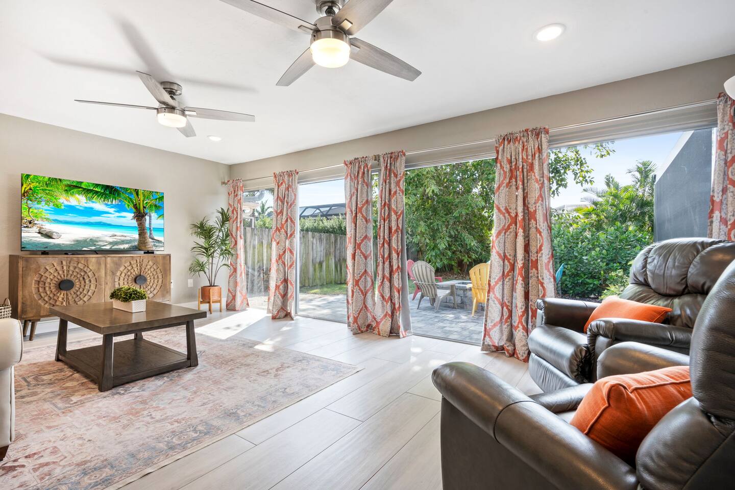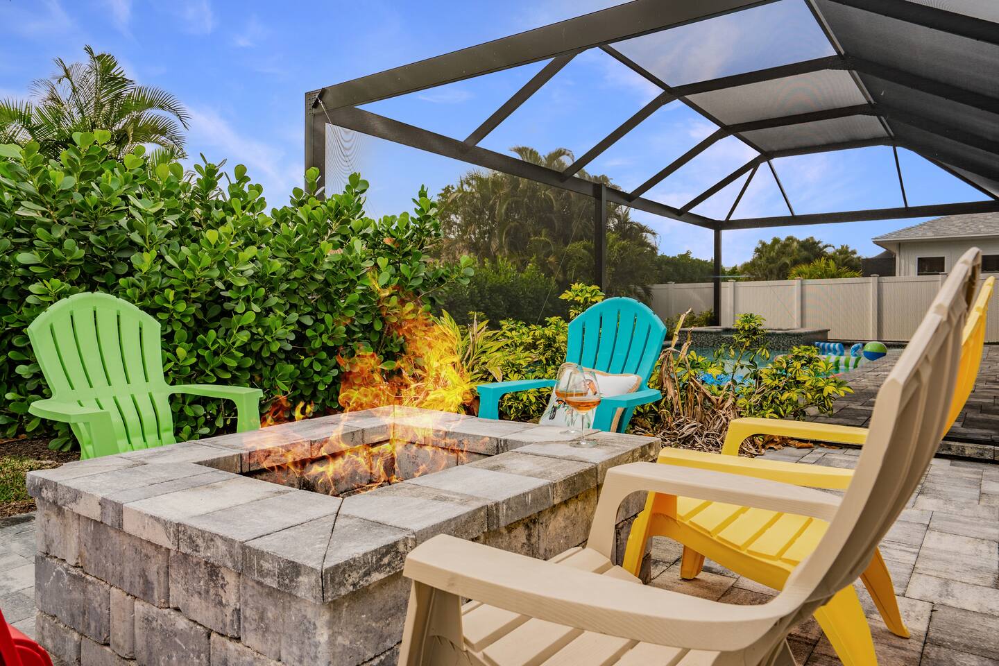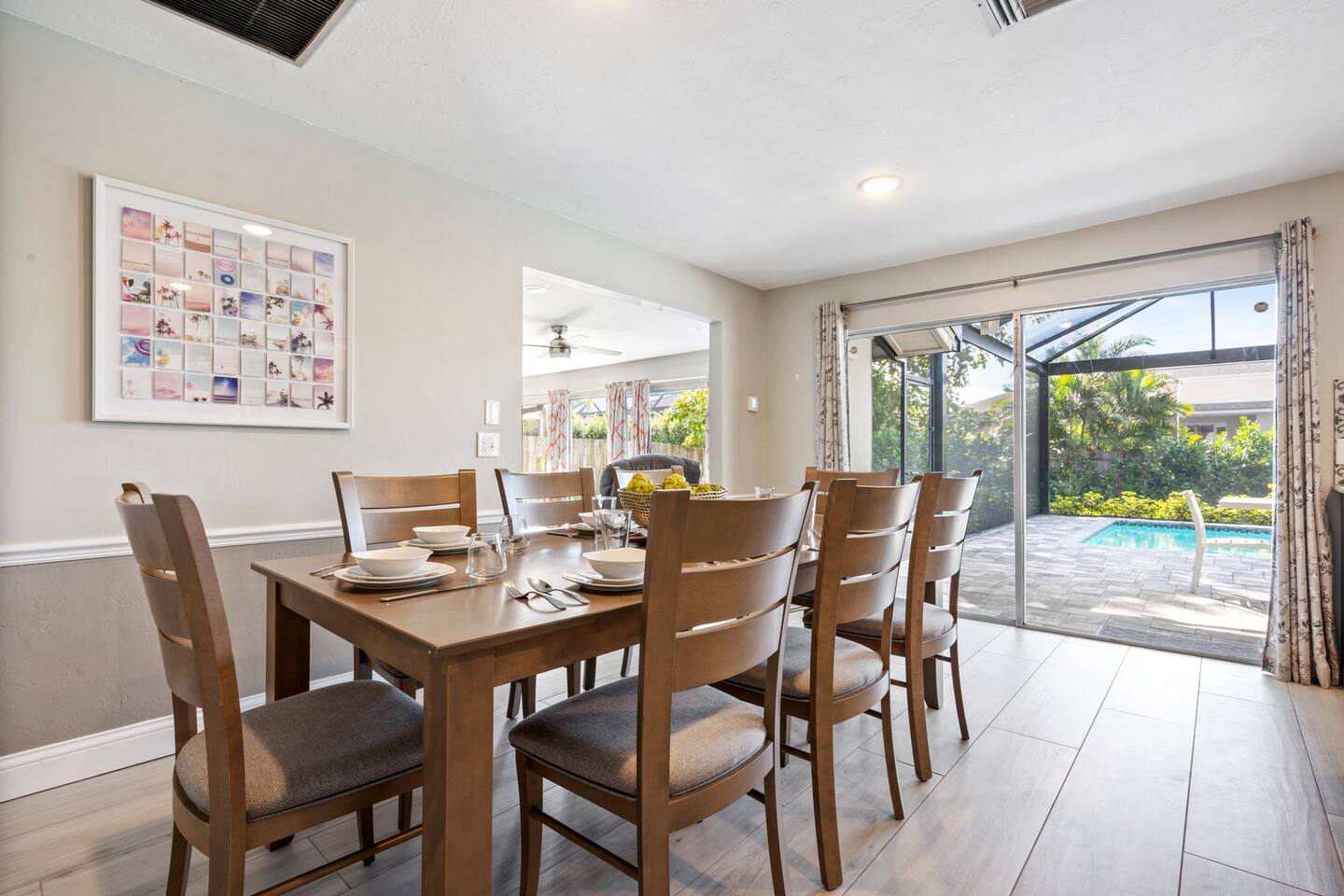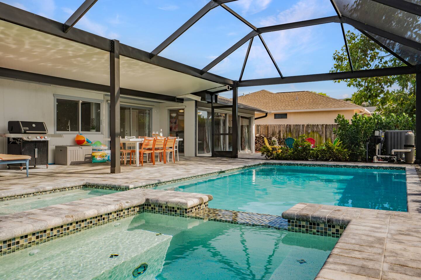 KEY FEATURES: ☀ Screened in Lanai with heated pool and hot tub, fire pit (please reach out 3 days in advance to have pool heat turned on) ☀ Outdoor patio dining for 8, 4 sun loungers ☀ Sleeps 9; 4 bedrooms, 1 king bed, 3 queen beds, pull out sofa bed ☀ 2 full bathrooms, one is a master suite ☀ Modern and well-equipped kitchen with seating for 8 guests ☀ All the beach chairs and amenities you need + bike rental service close by