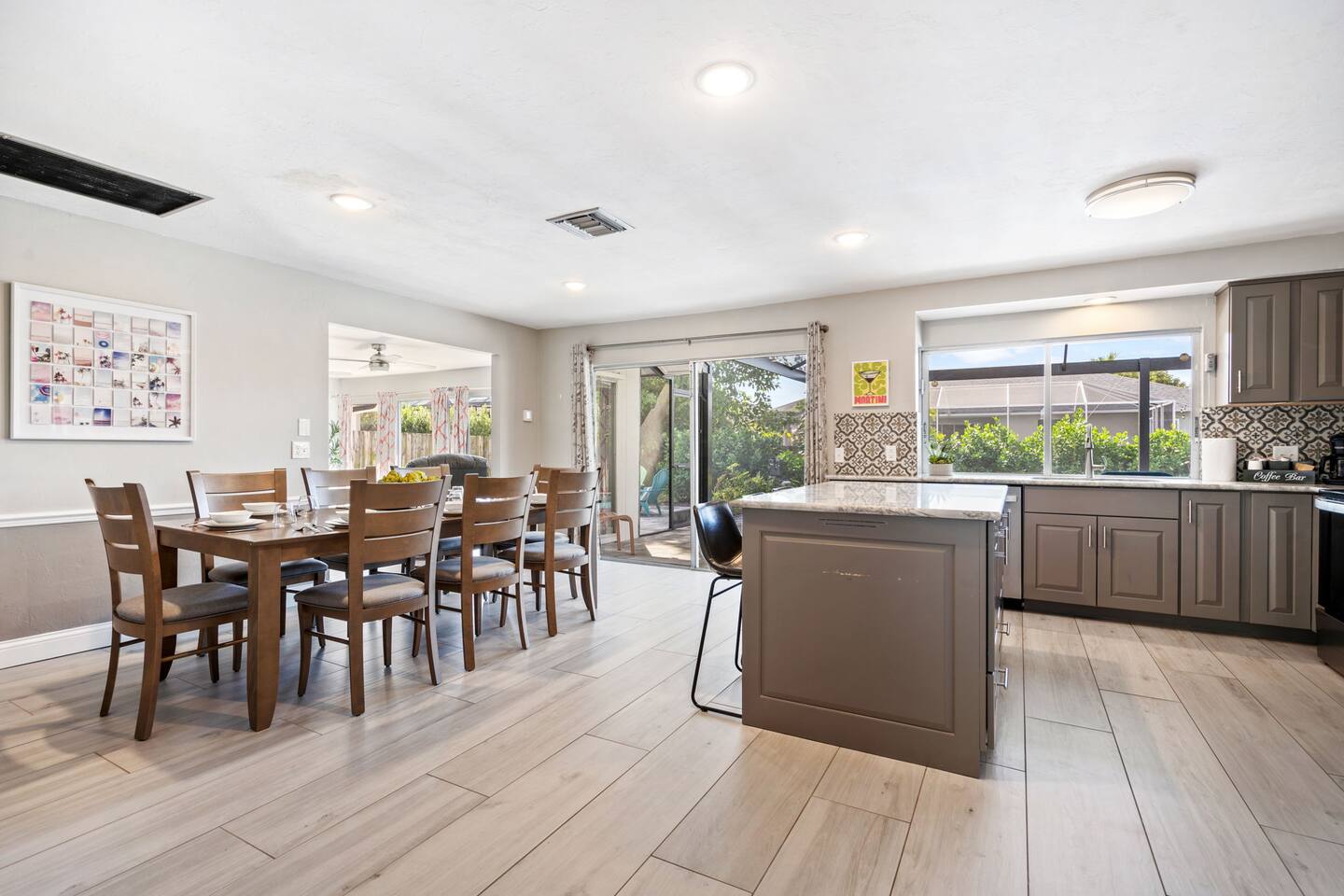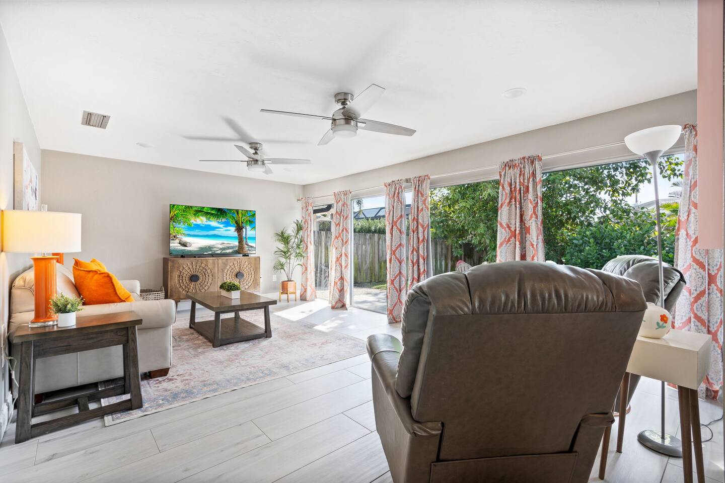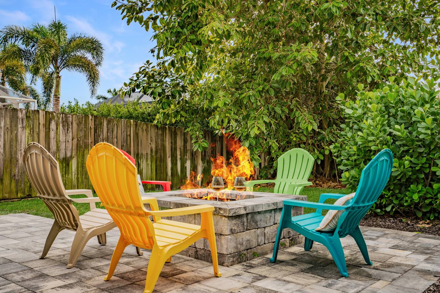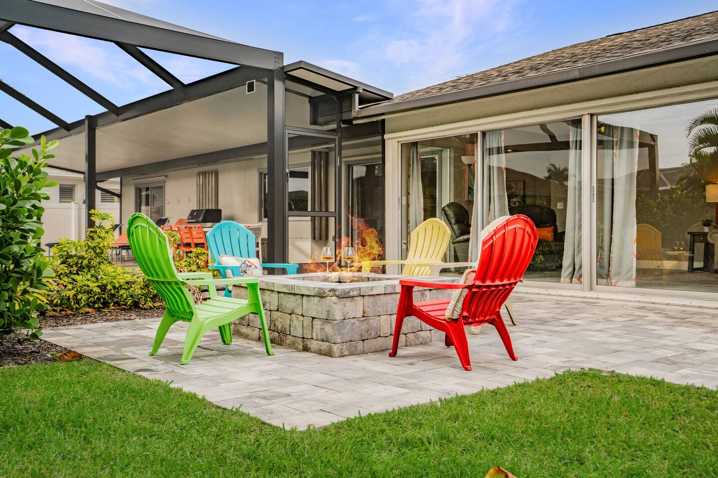 KEY FEATURES: ☀ Screened in Lanai with heated pool and hot tub, fire pit (please reach out 3 days in advance to have pool heat turned on) ☀ Outdoor patio dining for 8, 4 sun loungers ☀ Sleeps 9; 4 bedrooms, 1 king bed, 3 queen beds, pull out sofa bed ☀ 2 full bathrooms, one is a master suite ☀ Modern and well-equipped kitchen with seating for 8 guests ☀ All the beach chairs and amenities you need + bike rental service close by