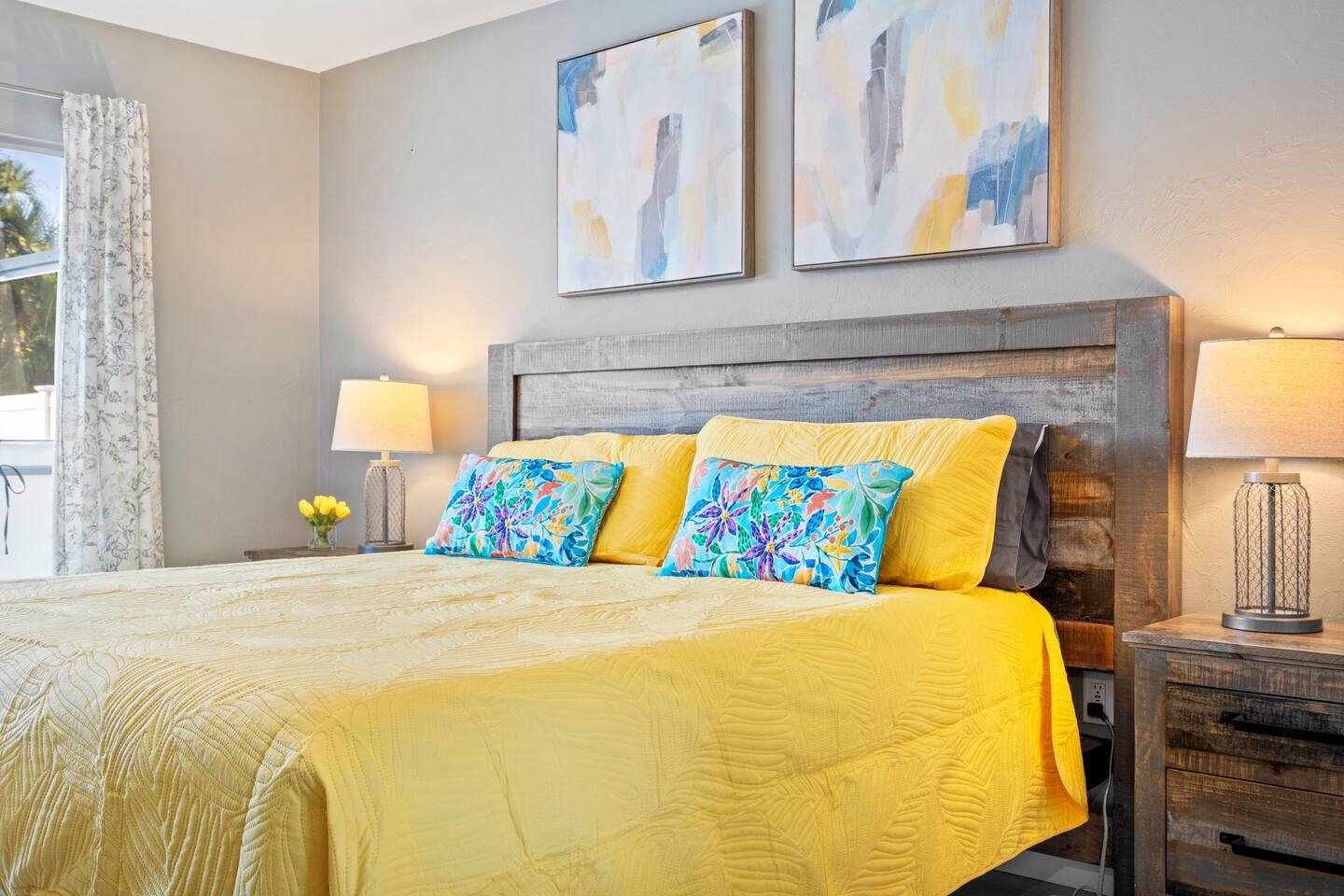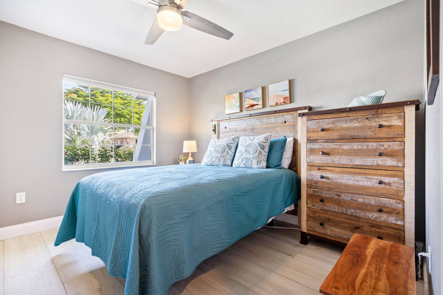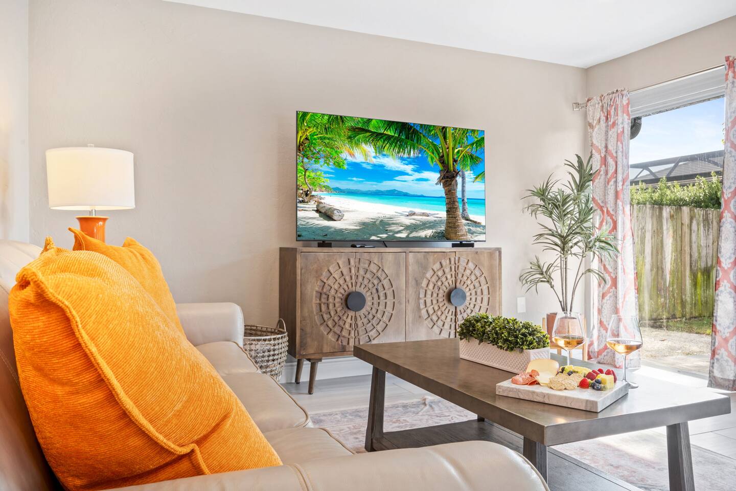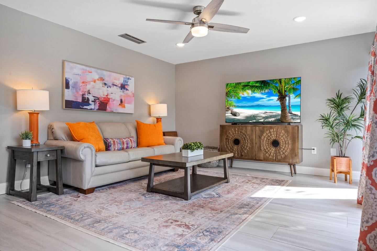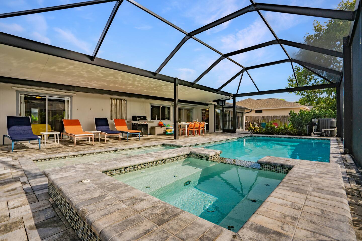 KEY FEATURES: ☀ Screened in Lanai with heated pool and hot tub, fire pit (please reach out 3 days in advance to have pool heat turned on) ☀ Outdoor patio dining for 8, 4 sun loungers ☀ Sleeps 9; 4 bedrooms, 1 king bed, 3 queen beds, pull out sofa bed ☀ 2 full bathrooms, one is a master suite ☀ Modern and well-equipped kitchen with seating for 8 guests ☀ All the beach chairs and amenities you need + bike rental service close by