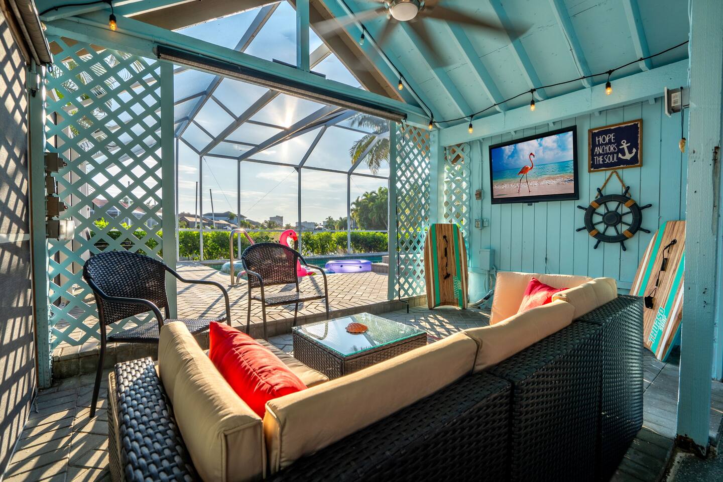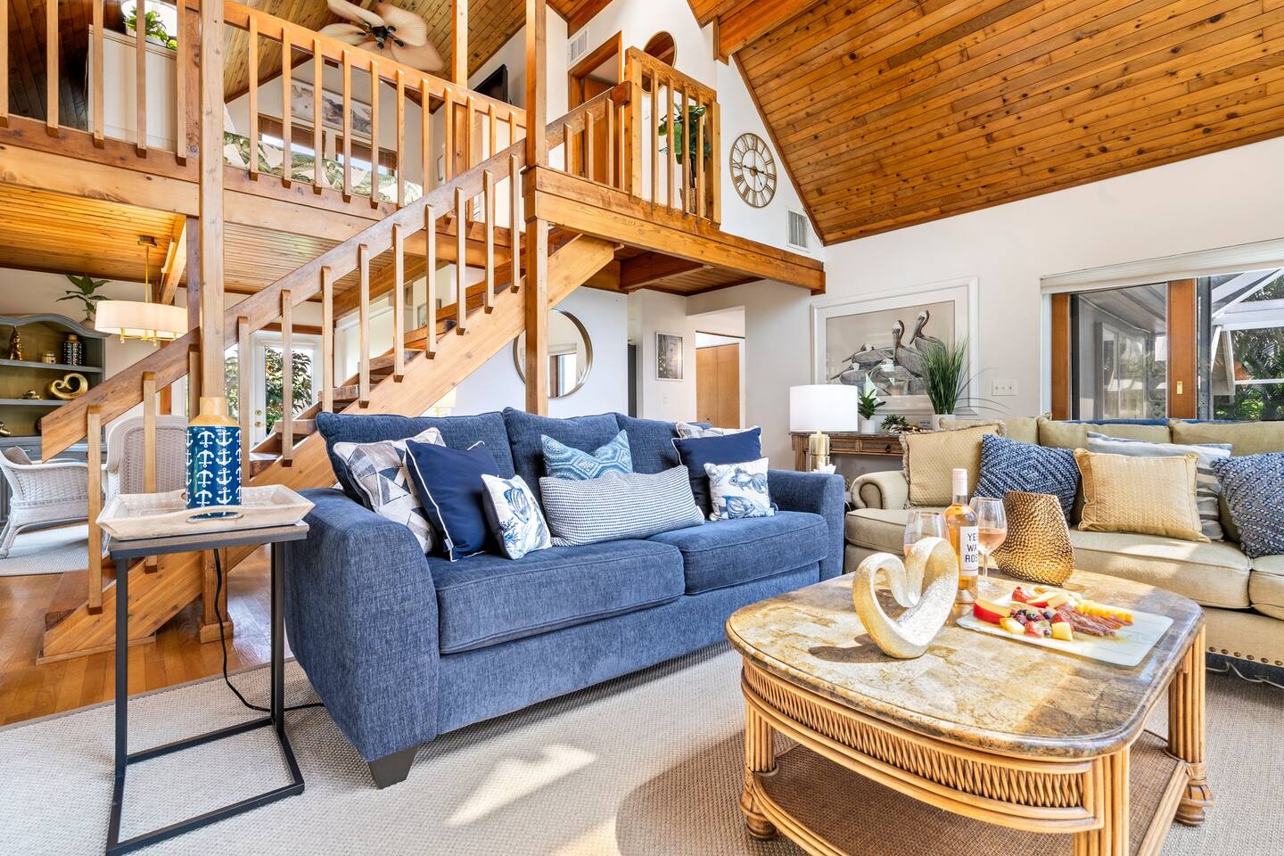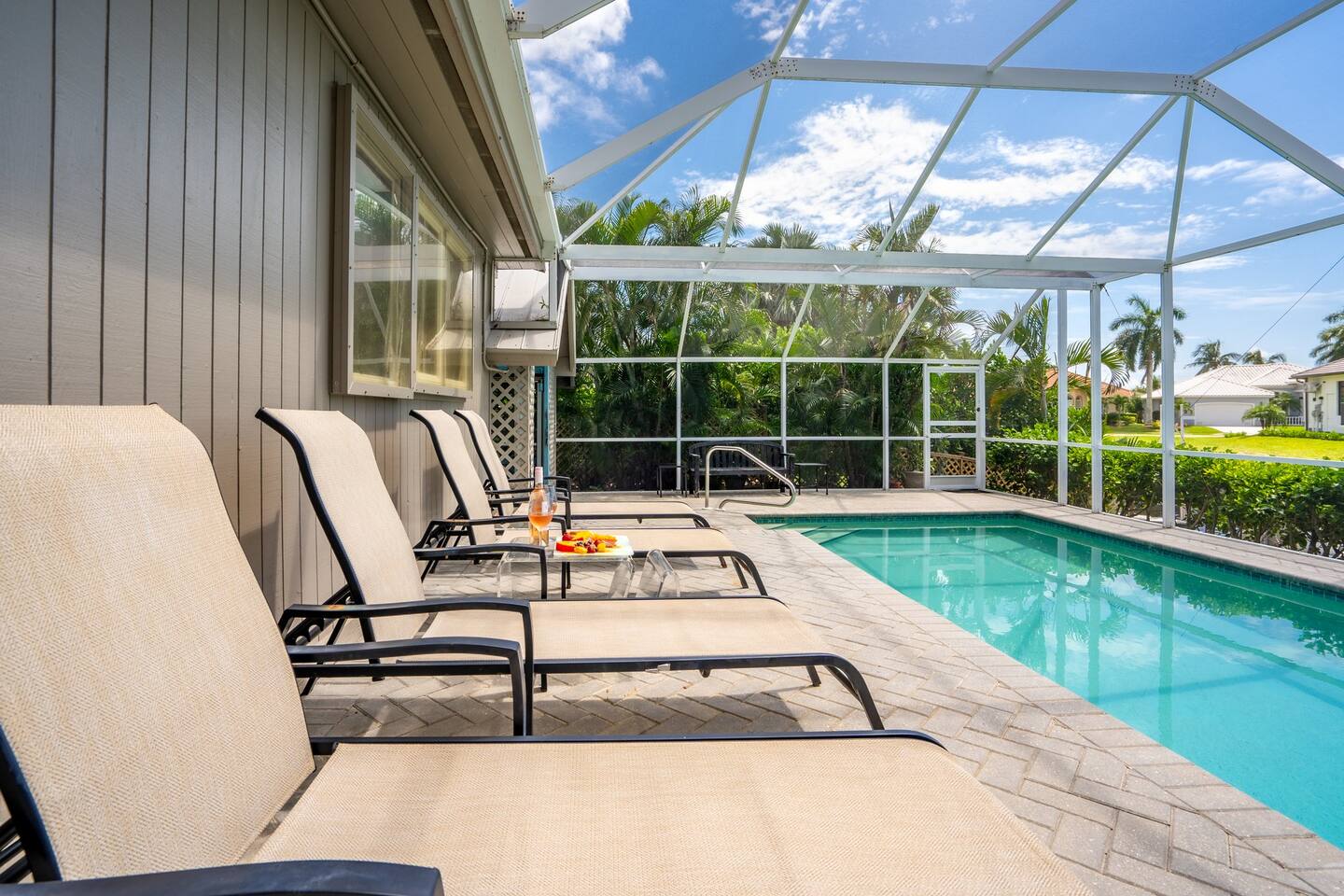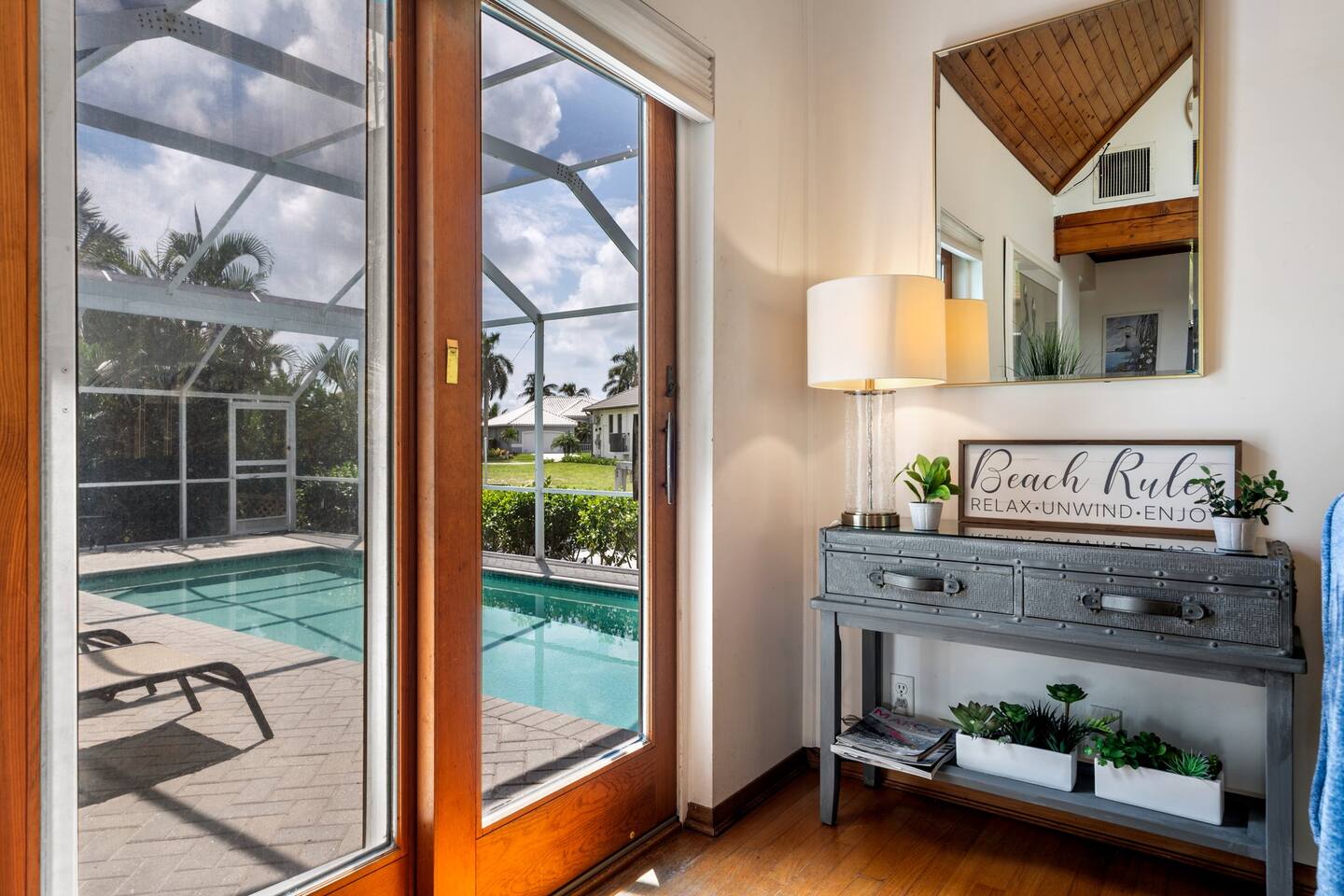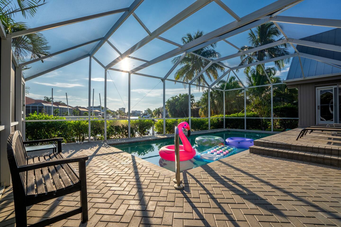 KEY FEATURES: ☀ Waterfront backyard with outdoor patio; Cabana room, 4 sun loungers, and a dock ☀ Sleeps 7; 3 bedrooms, 1 king bed, 1 Queen, 1 Bunk bed (full and twin) ☀ 2 Bathrooms; both with shower and tub options ☀ Modern and well-equipped kitchen with seating for 7 guests ☀ Heated pool (please reach out 3 days in advance to have pool heat turned on) ☀ Bike service available for rent ☀ Plenty of beach chairs and amenities! ☀ Can't beat the location! Close to beaches, shopping, surrounded by great food and plenty of options for local fishing charters, paddle board and kayak rentals, and many other water excursions! ☆☆ BEDROOMS ☆☆ This delightful home comfortably accommodates up to 7 guests across 3 bedrooms, offering plenty of space for a relaxing stay. The master bedroom is a stunning loft layout featuring a king bed for ultimate comfort, along with a private full bath. You'll also find a spacious closet for all your storage needs and a TV for entertainment. The water views from the oversized living room windows are a dream to wake up to. Perfect for anyone looking to unwind in this cozy oasis! The first floor boasts to bedrooms of to the left of the main entrance. The first guest bedroom features a cozy queen bed for a restful night's sleep. This inviting space includes a convenient closet for your storage needs and a TV for your viewing pleasure. You'll also have easy access to a full bathroom just steps away. For our second guest bedroom - this charming bunk room is perfect for both kids and adults! It features a full bed on the bottom and a single bed on top, providing ample sleeping space. There's plenty of storage in the closet for all your belongings, and a TV to keep everyone entertained during downtime. Best of all, the beautiful window offers a stunning view overlooking the pool and nearby water, adding a serene touch to your stay. ☆☆ BATHROOMS ☆☆ Our home offers two full bathrooms for your convenience. The downstairs bathroom features a tub/shower combo, perfect for a quick rinse or a relaxing soak. Upstairs, the master bathroom provides both a tub and a separate shower, ensuring added comfort and privacy for guests. Whether you're staying with family or friends, this layout makes freshening up a breeze! ☆☆ KITCHEN & LOUNGE ☆☆ Enjoy the comfort and convenience of our open-concept kitchen and dining area, perfect for preparing meals and gathering with loved ones. The kitchen is fully equipped with everything you need for cooking, while the dining space offers plenty of room to enjoy meals together. The dining room table has four cozy chairs and an additional three seats are available at the island counter. The kitchen has direct access out to the front patio, where you will find the grill to BBQ. The grill master will be able to get in and out with ease! The living room is a cozy and homey spot to relax, the water views and beautiful rustic interior create a welcoming atmosphere. Plenty of space for everyone to gather around on the couches and enjoy the scenery or watch tv after a fun day in the sun. For added convenience, a laundry area is also available, in the hallway closet right when you walk in, making it easy to keep things fresh during your stay! ☆☆ OUTSIDE SPACE ☆☆ Step outside and immerse yourself in this waterfront paradise! Relax on the dock, complete with chairs and a little table, perfect for enjoying the serene views. Take a dip in the screened-in heated pool, or unwind in the cozy cabana room, equipped with outdoor furniture, a mini fridge, and a TV for entertainment. For added fun, the garage has been transformed into a game room featuring foosball, board games, beach equipment, and a mini basketball hoop. Whether you’re soaking in the sun or enjoying some friendly competition, this outdoor space offers endless enjoyment for guests of all ages! ★☆ Book Today & Let Us Take Care Of You on Marco Island! ☆★