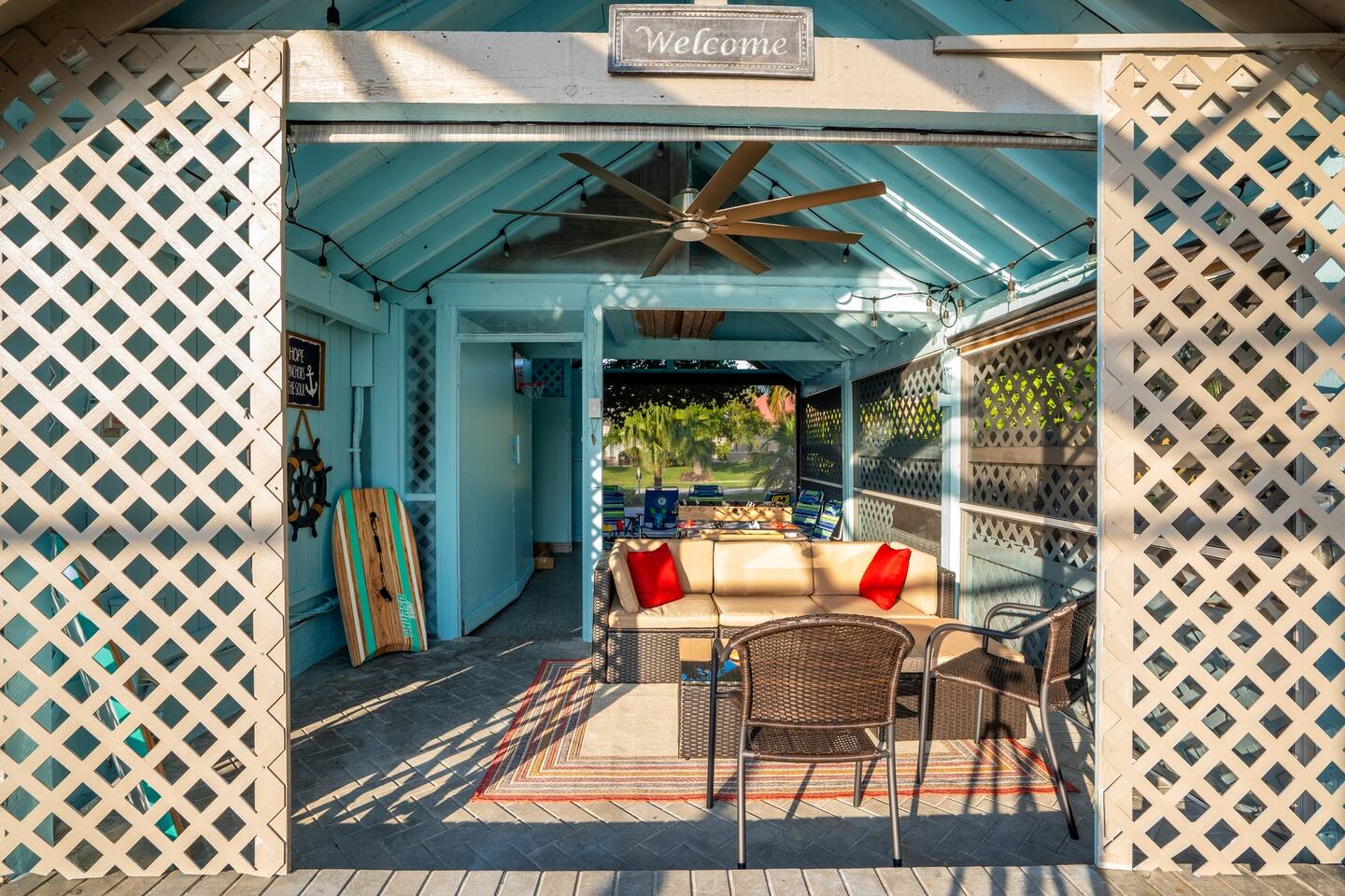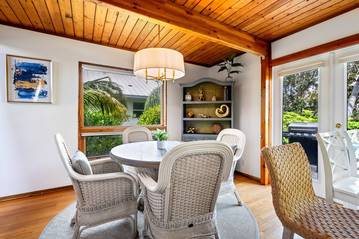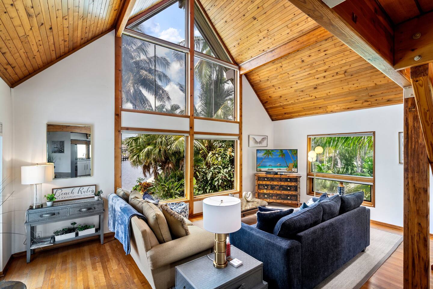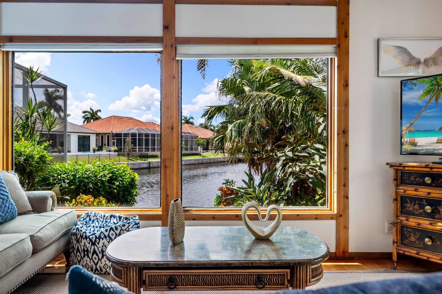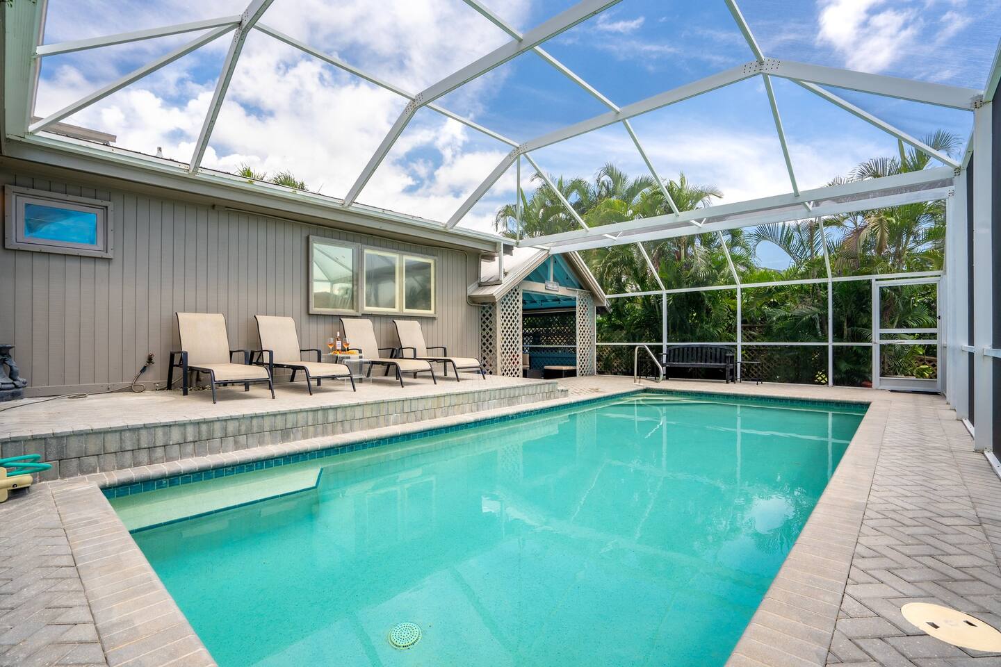 KEY FEATURES: ☀ Waterfront backyard with outdoor patio; Cabana room, 4 sun loungers, and a dock ☀ Sleeps 7; 3 bedrooms, 1 king bed, 1 Queen, 1 Bunk bed (full and twin) ☀ 2 Bathrooms; both with shower and tub options ☀ Modern and well-equipped kitchen with seating for 7 guests ☀ Heated pool (please reach out 3 days in advance to have pool heat turned on) ☀ Bike service available for rent ☀ Plenty of beach chairs and amenities! ☀ Can't beat the location! Close to beaches, shopping, surrounded by great food and plenty of options for local fishing charters, paddle board and kayak rentals, and many other water excursions! ☆☆ BEDROOMS ☆☆ This delightful home comfortably accommodates up to 7 guests across 3 bedrooms, offering plenty of space for a relaxing stay. The master bedroom is a stunning loft layout featuring a king bed for ultimate comfort, along with a private full bath. You'll also find a spacious closet for all your storage needs and a TV for entertainment. The water views from the oversized living room windows are a dream to wake up to. Perfect for anyone looking to unwind in this cozy oasis! The first floor boasts to bedrooms of to the left of the main entrance. The first guest bedroom features a cozy queen bed for a restful night's sleep. This inviting space includes a convenient closet for your storage needs and a TV for your viewing pleasure. You'll also have easy access to a full bathroom just steps away. For our second guest bedroom - this charming bunk room is perfect for both kids and adults! It features a full bed on the bottom and a single bed on top, providing ample sleeping space. There's plenty of storage in the closet for all your belongings, and a TV to keep everyone entertained during downtime. Best of all, the beautiful window offers a stunning view overlooking the pool and nearby water, adding a serene touch to your stay. ☆☆ BATHROOMS ☆☆ Our home offers two full bathrooms for your convenience. The downstairs bathroom features a tub/shower combo, perfect for a quick rinse or a relaxing soak. Upstairs, the master bathroom provides both a tub and a separate shower, ensuring added comfort and privacy for guests. Whether you're staying with family or friends, this layout makes freshening up a breeze! ☆☆ KITCHEN & LOUNGE ☆☆ Enjoy the comfort and convenience of our open-concept kitchen and dining area, perfect for preparing meals and gathering with loved ones. The kitchen is fully equipped with everything you need for cooking, while the dining space offers plenty of room to enjoy meals together. The dining room table has four cozy chairs and an additional three seats are available at the island counter. The kitchen has direct access out to the front patio, where you will find the grill to BBQ. The grill master will be able to get in and out with ease! The living room is a cozy and homey spot to relax, the water views and beautiful rustic interior create a welcoming atmosphere. Plenty of space for everyone to gather around on the couches and enjoy the scenery or watch tv after a fun day in the sun. For added convenience, a laundry area is also available, in the hallway closet right when you walk in, making it easy to keep things fresh during your stay! ☆☆ OUTSIDE SPACE ☆☆ Step outside and immerse yourself in this waterfront paradise! Relax on the dock, complete with chairs and a little table, perfect for enjoying the serene views. Take a dip in the screened-in heated pool, or unwind in the cozy cabana room, equipped with outdoor furniture, a mini fridge, and a TV for entertainment. For added fun, the garage has been transformed into a game room featuring foosball, board games, beach equipment, and a mini basketball hoop. Whether you’re soaking in the sun or enjoying some friendly competition, this outdoor space offers endless enjoyment for guests of all ages! ★☆ Book Today & Let Us Take Care Of You on Marco Island! ☆★